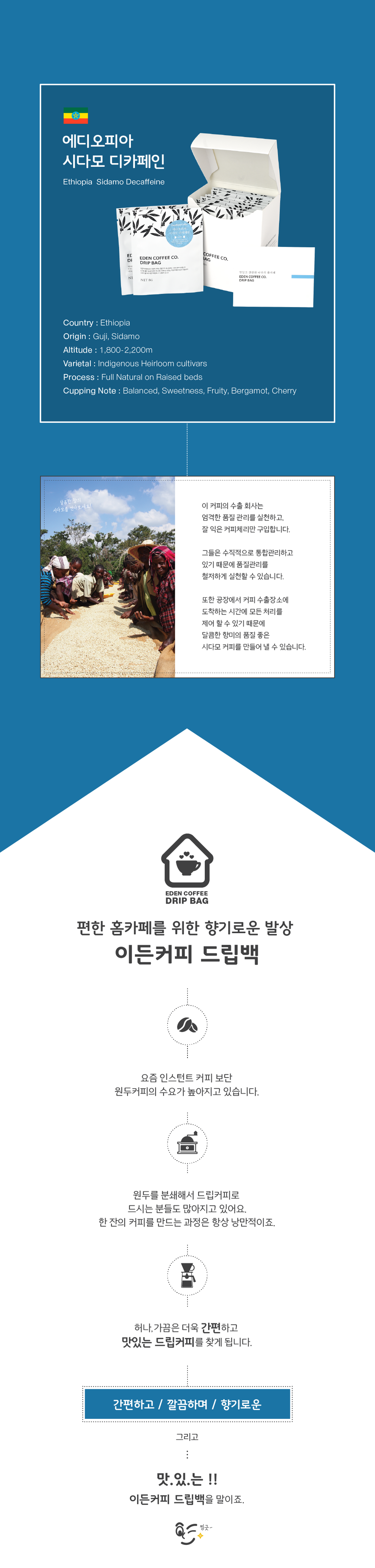에티오피아 시다모 디카페인 커피는 스위스 워터 프로세스 방식으로 물을 이용하여 카페인을 제거하였으며 화학성분을 사용하지 않고 물을 이용한 방법으로 카페인을 제거하여 안전성과 커피 본래 맛을 유지하고 있습니다. 일반 커피에 비해 1/10수준의 카페인 양을 가지고 있어 카페인에 민감하신 분이나 임산부가 드시기 좋은 커피입니다.